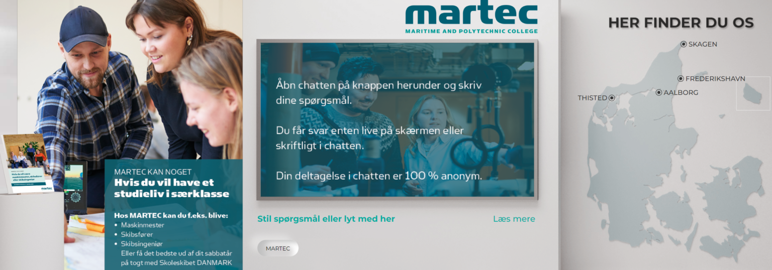 Du kan komme til Åbent Hus på vores afdelinger i Frederikshavn, Aalborg og Thisted. Hertil kommer en række virtuelle arrangementer, for at gøre det nemt for dig. Husk også, at du kan blive studerende for en dag og altid kan booke en rundvisning på vores afdelinger også.