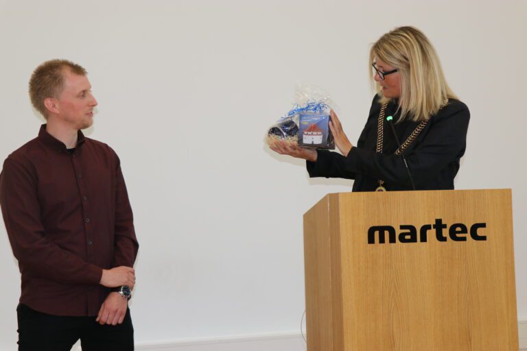 • Formand for MARTEC Maskinmesterklub, Arly Nielsen, uddelte pengegave til Rasmus Marius Jensen.