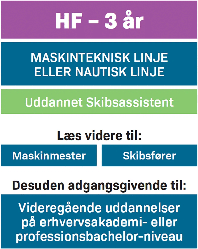 En HF giver ½ års merit på de videregående professionsbacheloruddannelser til maskinmester og skibsfører. Du kan også læse videre til skibsfører på den konventionelle uddannelse. Både maskinmester- og skibsfører-uddannelserne giver mulighed for jobs både til søs og på land.
